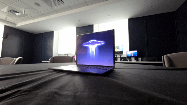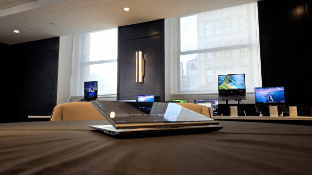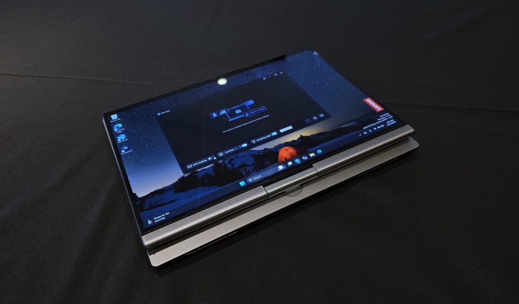 When the screen is collapsed, the cover-side screen can be used to display various widgets and information, allowing the laptop to work nicely as a presentation tool, amongst other use cases.
