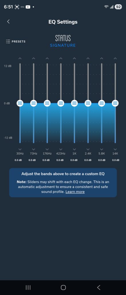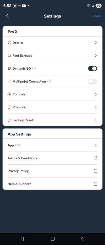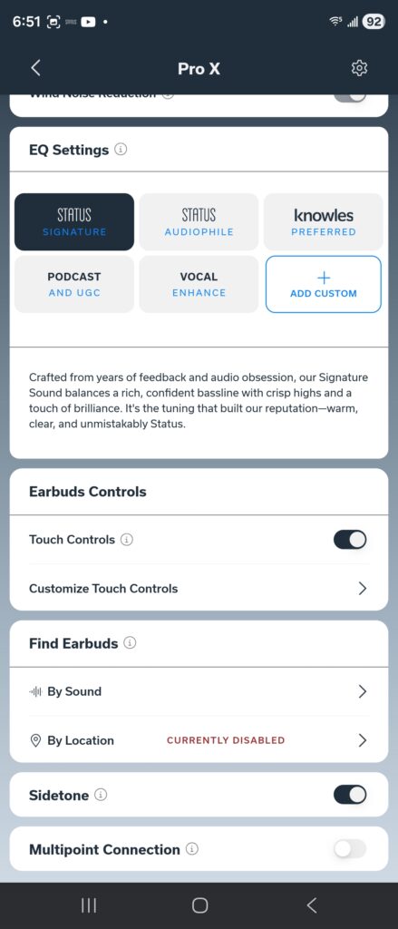 All of the features and customization options for the Status Pro X are managed through the free Status Hub mobile app. Through the app, you can toggle listening modes, swap between EQ’s, and customize your own EQ’s. Going further, you can also access additional features like Side Tone, Dynamic EQ, Find Earbuds, and Multipoint Connection. As far as a dedicated mobile management app goes, the Status Hub gives you a respectable amount of control while being straightforward to use. Even the headset’s more niche features have info pop-ups that you can tap on to get a brief explanation of the feature.