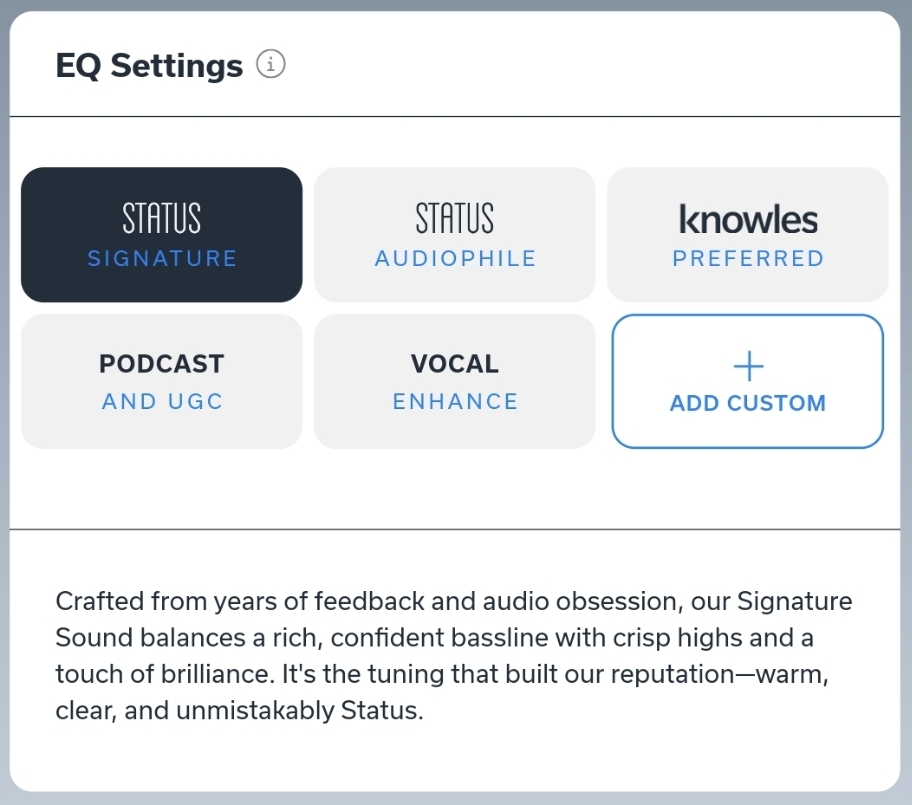 When it came to the meat and potatoes of the headset, the Status Pro X impresses with its sound presentation. The earbuds come with five preset EQ settings: Status Signature, Status Audiophile, Knowles Preffered, Podcast and UGC, and Vocal Enhance. The default sound presentation of the Status Signature delivers clear vocals, rich instrumentals, clean highs, and a vibrant bass. As a default, it is an enjoyable presentation that one would be satisfied with if there were no other presets to choose from.
